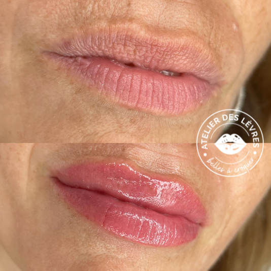 Les lèvres légèrement recolorées, **paraissent** repulpées et éclatantes.Leur contour est défini avec précision et subtilité, les rides et ridules disgracieuses durablement estompées.